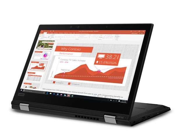 ThinkPad L390 Yogaは、ノートPCとしても、タブレットとしても使える13.3型で回転型の2 in 1ノートPC。ペン入力に対応し、タッチペン「ThinkPad Pen Pro」は本体側面に収納することで、本体から充電を行うことができる。ディスプレイは1,920×1,080のIPS液晶となっており、マルチタッチ10点に対応。またアウトカメラも搭載可能となっている。