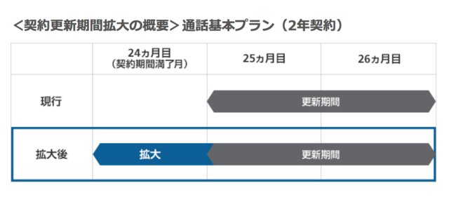 現在提供中の2年契約などの自動更新がある料金プランについて、2019年3月1日から契約期間満了月も更新期間へと変更。これにより2年契約の場合、契約解除料がかからない更新期間が、これまでの2ヶ月間から1ヶ月伸び、3ヶ月間となる。