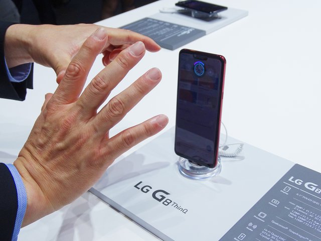 そして最後に紹介する端末は、ふたたびLG。ハンドジェスチャー操作に対応したフロント側の「Z Camera」をのせた「LG G8 ThinQ」だ(関連ニュース)。パネル側に向かって手をかざすと、1秒ぐらいで独自のUIが立ち上がり、かざした手を左右にスワイプ・回転して音楽再生をコントロールしたり、指先を絞ってカメラのシャッターを切るなどの直感的な操作ができるのだ。