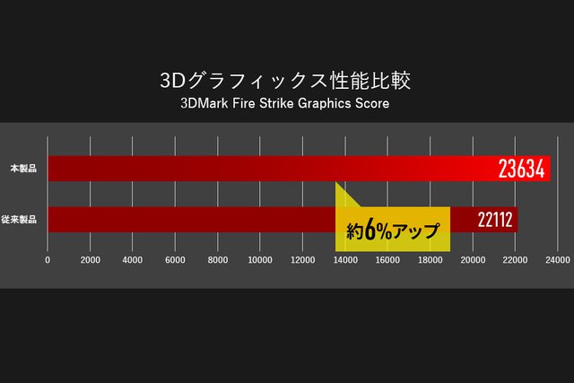 CPUには、8コア/16スレッド駆動の「第9世代 インテル CPUプロセッサー」を搭載することで、従来の「Core i7-7700K」と比較してコア/スレッド数が倍になった。また最上位モデルでは「Core i9-9900K」プロセッサーを搭載することで、3DMarkスコアで約78%向上した。