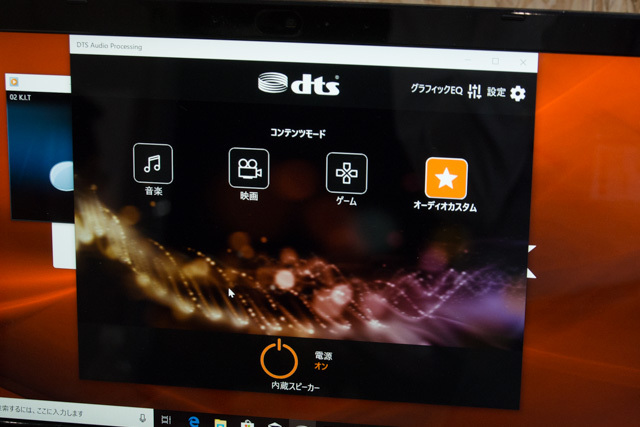 内蔵スピーカー「Dynamic Wide Sound」は従来モデルから引き続きオンキヨーと共同開発を行ったもので、ディスプレイ下部の左右に配置。指向性や音ヌケの改善を図っている。内部構造も、中心部から外縁までタイムラグ無く振動する平面振動板と、ユニットを2か所で支持する多点駆動構造を採用し、クリアで安定した高音域を追求した。また、DTSと共同開発した音響制御ソフトウェア「DTS Audio Processing」を搭載し、コンテンツに合わせた音響設定を可能とする。