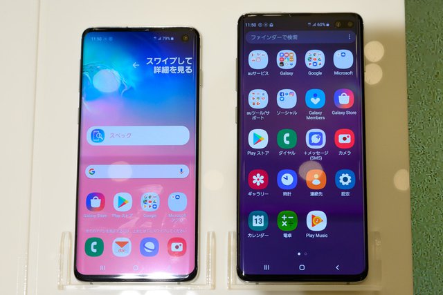 サムスンのGalaxy S10/S10+は、大画面の有機ELディスプレイとパワフルなプロセッサーを持つとするモデル。「動画やゲームは立体感があり、色鮮やかに表示できる」と紹介された。望遠/広角/超広角のトリプルカメラを搭載する。ともに有機ELを採用し、S10+は6.4インチ、S10は約6.1インチのモデルとなっている。