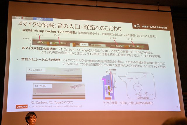 このマイクの設計にあたり、音の入り口にもこだわったと同研究所のシステム機構設計 宮本旅人氏は解説。マイクの穴の中の空気の動きの共振周波数をシミュレーションし、人の声の帯域を最大限拾うように、穴の径や長さを最適化したという。マイクを密閉することで筐体内のノイズを拾わないように配慮している。加えて狭額縁に基盤を収めるため、基盤幅の最小化にも気を使ったと説明した。