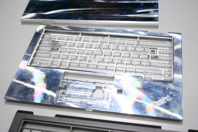 X1 Yogaに採用されるアルミボディは、CNCアルミ切削によって製造される。曲線的な動きなど切削方法にこだわることでデザインと手触りに配慮。また表面にはヘアライン加工やアノダイズ処理が施され、色については素材を生かす色の開発が行われた。継ぎ目のない一体ボディや落下シミュレーションによって堅牢性に配慮し、ヒンジの小型化やタッチガラスの薄型化などで薄型・小型化にも力が入れられている。