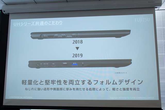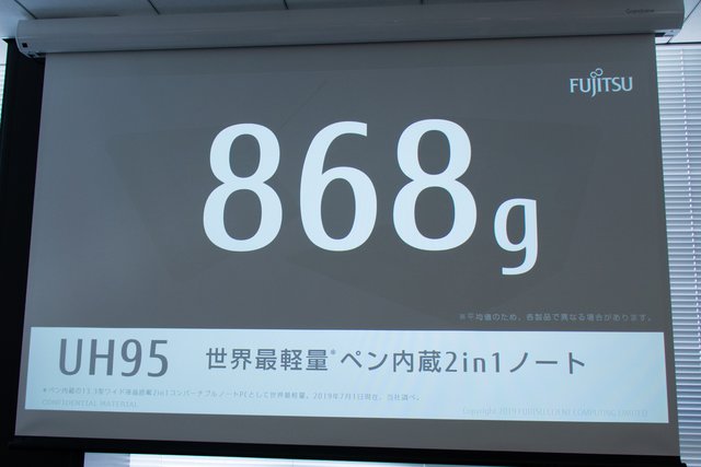 UHシリーズのUH95/D2は、昨年発売した「UH-X/C3」(関連ニュース)の兄弟機にあたり、タッチペン内蔵の2in1ノートPCとして世界最軽量(868g)を謳うモデル。フォルムをデザインする段階から軽量さ/堅牢さの両立を意図しており、側面に厚みを持たせねじれに強くしたほか、評価試験においても地面への落下、摩擦、繰り返しの開閉など日常の利用シーンを想定してチェックしているという。
