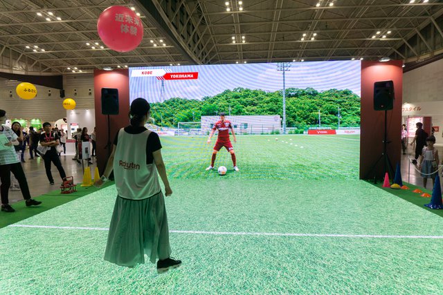 そんな中で人気だったのが体験型の展示だ。「Virtual Football Practice」では、巨大なディスプレイが正面だけでなく床面にも展開され、Jリーグ ヴィッセル神戸の選手とパスのやりとりをバーチャル体験できるデモが人気だった。