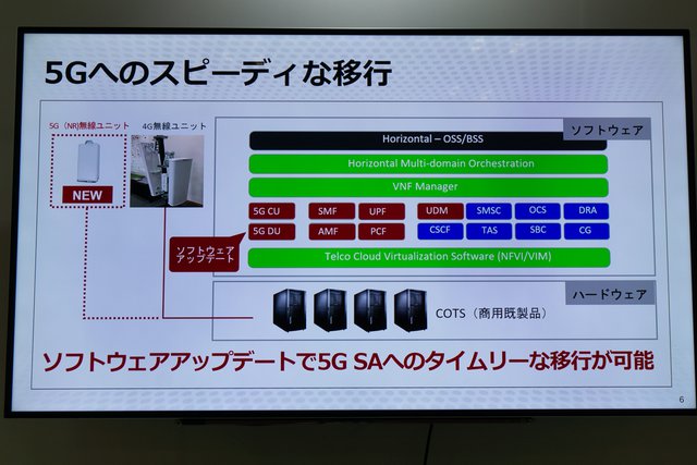 楽天はMNO事業に新規参入するにあたり、「完全仮想化クラウドネットワーク」と呼ぶクラウドベースのネットワークアーキテクチャを用いる。これをごく単純化して説明すると、従来のMNOネットワークが専用のハード/ソフトによってそれぞれが不可分なかたちで構築されていたのに対し、完全仮想化クラウドネットワークではCOTS(商用既製品)のハード上にソフトウェアベースで構築される。これによりエンド・トゥ・エンドでのクラウドネットワークが構築でき、より低コストかつ柔軟なアップデートを可能にする。5Gへのスピーディーな移行も、この完全仮想化クラウドネットワークにより実現できるとしている。