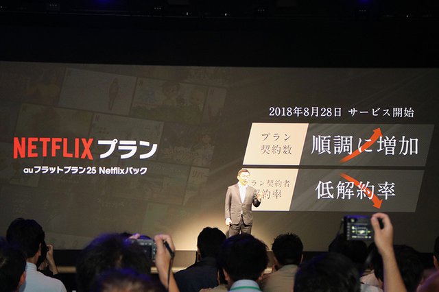KDDI代表取締役社長の高橋誠氏が登壇。各施策について紹介した。まず新プランについては、2018年8月にスタートしたNetflixとのバンドルプラン『auフラットプラン25 Netflixパック』が好調で、契約数も順調に増加し、バンドルとしたことで解約率も低くなっていることを説明。