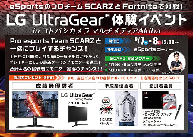 無料体験イベント「LG UltraGear 体験イベント in ヨドバシカメラ マルチメディア Akiba」は、9月7日(土)8日(日)の各日13:00〜18:00に、2階eSportゾーンにて行われる。同社がゲーミングイベントを取材するのは今回が初とのこと。