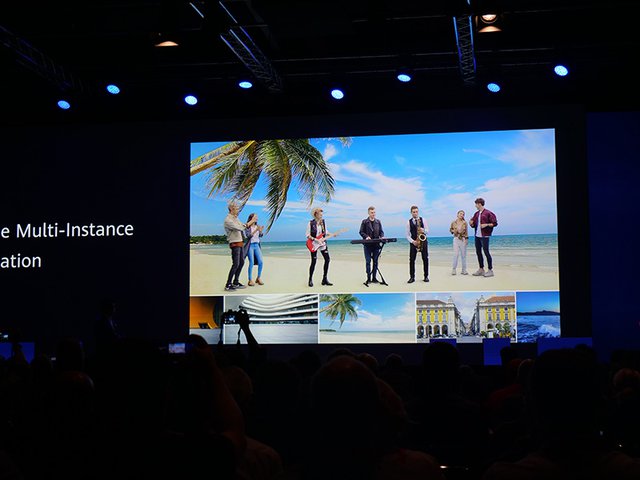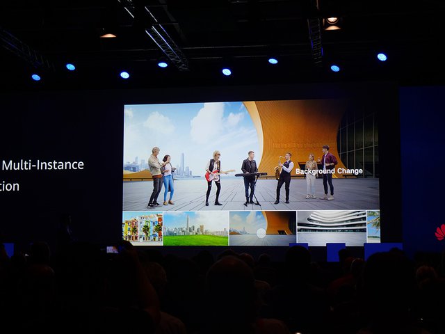 このAI処理性能を使ったイメージデモ動画も再生された。5人組が楽器を演奏しているところを撮影すると、AIがそれぞれの演奏者と楽器部分を判別。そのうち消したい人物を消したり、背景をまったく別のものに差し替えたり、特定の人物を大きくしたり、といったことが自在に行える。