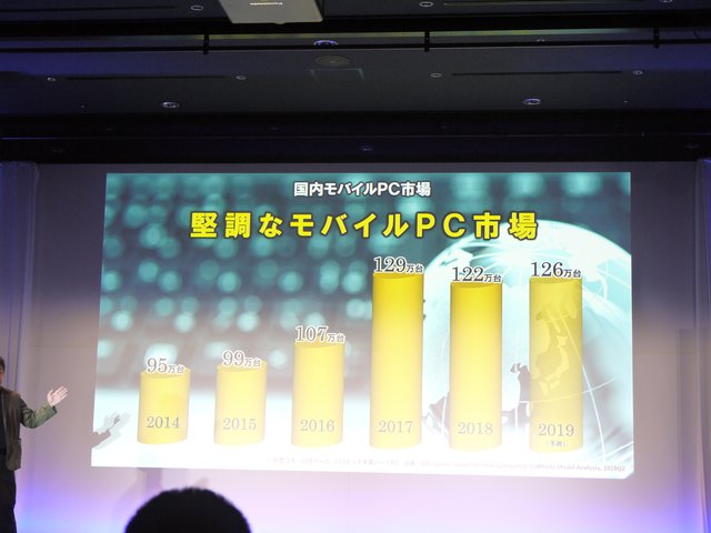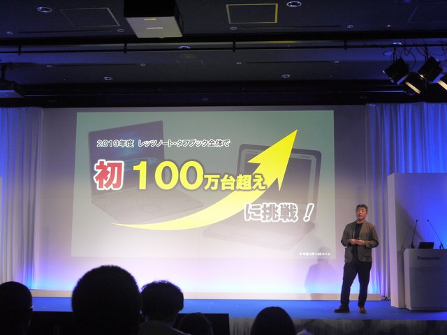 より薄く、より軽く、よりコンパクトになった今回のレッツノート新製品によって、「2019年度は、レッツノートとタフブック全体で、初の100万台超えに挑戦する」と強い意気込みを表明した。