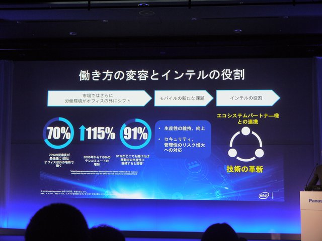 労働環境がオフィスの外にシフトしていく昨今、モバイルの新たな課題は生産性の維持・向上であり、セキュリティや管理への高まるリスク対応が必要だと指摘。インテルはパートナーとの連携によって技術の革新をもたらし、生産性の改善やセキュリティの向上を推進、管理時間の短縮に貢献していく、とした。