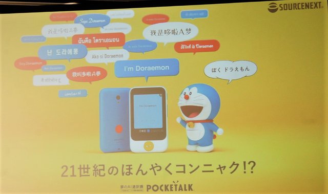 また、初のコラボレーションモデルとして「ドラえもん Edition 特別セット」(34,800円・税別・2年のグローバル通信付き)をラインナップ。ドラえもんカラーに4次元ポケットをイメージしたポーチなどを揃えた特別セット。「ドラえもんはアジアや欧州など60以上の国で放送されています。ポケトークもソースネクストも、そうした地域では知名度が決して高いとは言えず、ドラえもんの知名度を活かし、特にアジアには積極的に進出していきたい」とさらなる海外展開へ意気込みを示した。