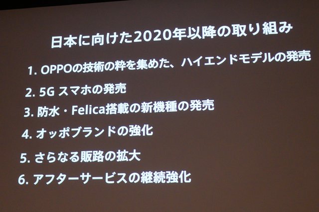 なお同氏によると、この6つの項目は全てクリアできたとのこと。10倍ズームスマホでは「Reno 10× Zoom」、日本市場向けのスマホでは「Reno A」、また低価格モデルの「A5 2020」が2019年にラインナップされた。
