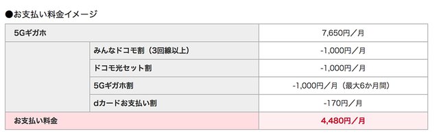 5Gギガホでは、新たに契約してからの最大6か月間、月額料金を1,000円割引く「5Gギガホ割」を提供。併せて「みんなドコモ割(3回線以上)」「ドコモ光セット割」「dカードお支払い割」を適用すると、最大6か月間、月額4,480円から利用することができる。