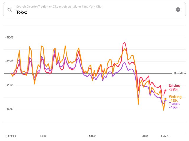 実際に東京のデータを見てみると、緊急事態制限が出されてから特に、徒歩や公共交通機関での移動が大きく減ったことがわかる。