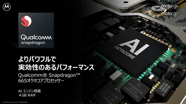 パフォーマンス面の仕様はいずれもg8 plusと共通で、SoCにはQualcomm「Snapdragon 665 2.0GHz オクタコアプロセッサー」を搭載し、メインメモリは4GB、ストレージは64GB。microSDにも対応し、最大512GBの容量拡張も行える。