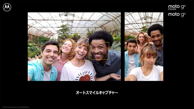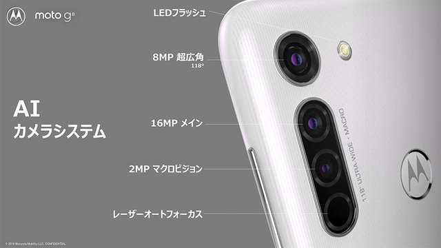 またg8 powerのカメラは4眼構成で、1,600万画素のメインセンサー(F1.7)、800万画素の広角動画カメラ(118度)、200万画素のマクロ、800万画素の2倍光学ズームに対応する。インカメラは1,600万画素で、こちらもディスプレイフラッシュを搭載する。