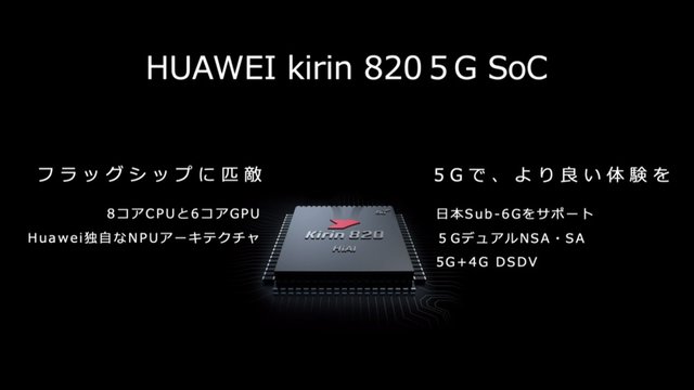 約6.5インチでアスペクト比20:9の液晶ディスプレイを採用。画面占有率約90.3%のパンチホールフルビューディスプレイで、色域はNTSC比96%。解像度は2,400×1,080ピクセルで、HDR10に対応する。SoCには、HUAWEI Kirin820 5Gを採用する。RAMは6GBで、ストレージ容量は128GB。NMカードにより最大256GBまでの拡張もできる。