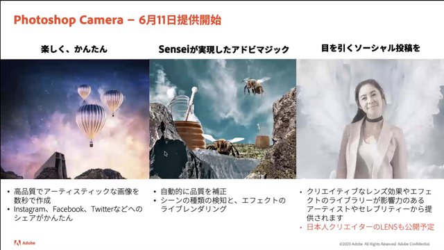AdobeのAIプラットフォーム「Adobe Sensei」を利用してさまざまな画像加工ができることが大きな特徴で、初期状態で80種類以上の「レンズ」フィルターを搭載。SNSへのシェアも簡単に行えるカメラアプリとなっている。
