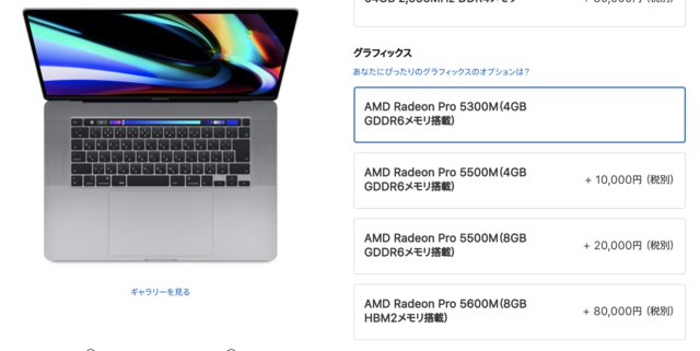 アップルは、16インチMacBook Proに新たなグラフィックスオプション「AMD Radeon Pro 5600M(8GB HBM2メモリ搭載)」を追加した。公式ストアのカスタマイズで選択でき、標準の「AMD Radeon Pro 5300M(4GB GDDR6メモリ)」にプラス80,000円(税抜)で購入できる。