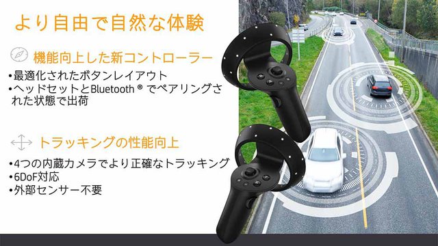 ヘッドセットには前面2つ/左右2つのカメラを搭載し、外部センサー無しで6DoFに対応。トラッキング精度は従来の2倍とし、新コントローラーによる自然な操作感をアピールする。またヘッドセットと直接Bluetoothでペアリングすることで、簡単にセットアップが可能という。