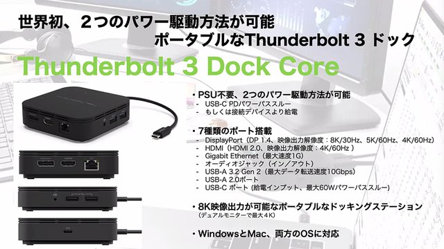 Thunderbolt 3 Dock Coreは、ACアダプター不要で使用できるThuderbolt 3ドック。USB-C PDパワーパススルー/接続デバイスからの給電といった2つの駆動方法に対応する。