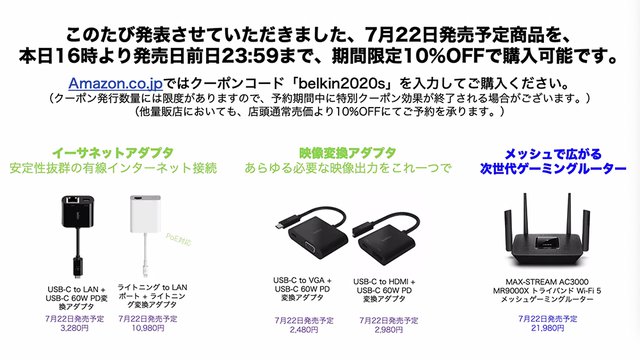 なお、7月22日発売の5製品(イーサネットアダプター2製品/映像変換アダプター2製品/ゲーミングルーター)に関しては、7月21日23:59までの期間限定にて10%オフで販売。Amazonではクーポン「belkin2020s」を入力することで適用できるほか、他量販店においては予約時に10%オフで購入できる。