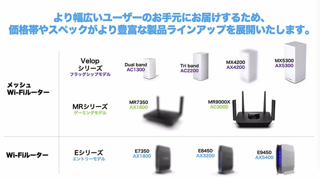 今回明らかになったのは5製品で、最上位のVelopシリーズからは、Wi-Fi6対応モデル「MX5300」の下位モデルとなる「MX4200」が登場予定。本日発表されたゲーミングモデルの下位モデルとして、「MR7350」の発売も予定する。