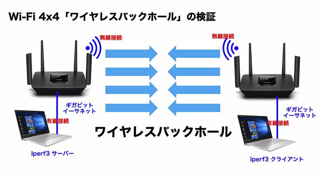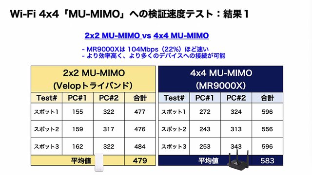 また、4×4 MU-MIMOに対応することで、同社Velopのトライバンドモデルと比較して22%ほど高速に通信ができたと説明。また2台のMR9000Xと端末をそれぞれ有線接続するワイヤレスバックホールでは、「どこでも有線のパフォーマンスを得られる」とアピールする。