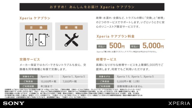 保証サービスとして「Xperia ケアプラン」を用意。月払い500円/年払い5,000円にて加入できるソニーストア限定サービスで、上限額5,000円で修理できる「修理サービス」と、有償で同一機種と交換できる「交換サービス」に対応する。