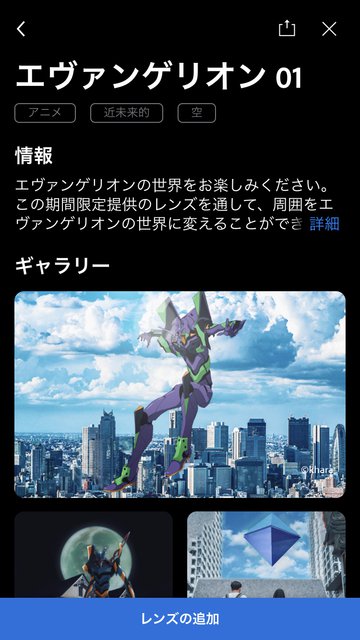 Adobe Photoshop Cameraアプリ内から、「レンズを追加」→「エヴァンゲリオン01」と進み、該当のレンズを追加するだけで利用できる。