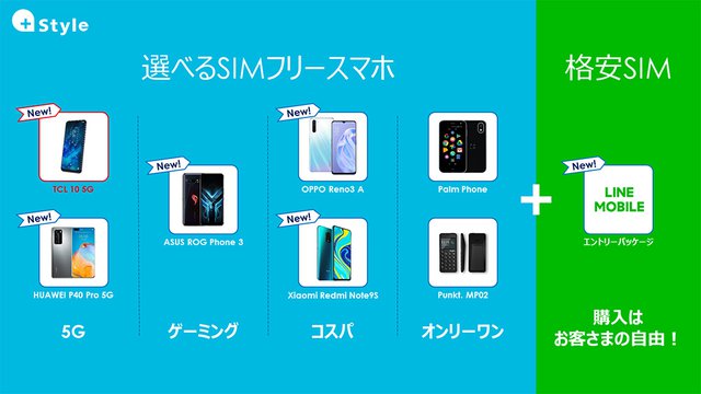 新たに取り扱いをはじめるスマートフォンは、TCL「TCL 10 5G」、ASUS「ROG Phone 3」、Huawei「HUAWEI P40 Pro 5G」、Oppo「OPPO Reno3 A」、Xiaomi「Redmi NOTE 9S」の5機種。これに現在販売中の「Palm Phone」「Punkt. MP02」の2機種を合わせた全7機種が並ぶ格好だ。