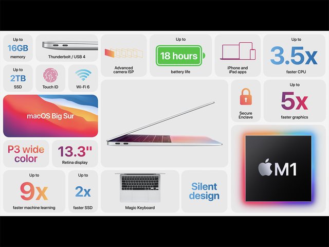 M1の搭載により、前モデルと比較してCPUは最大3.5倍、グラフィックス性能は最大5倍の速さを実現。加えて最も売れているWindowsノートPCの3倍、過去1年間で発売されたノートPCの98%よりも高速だという。また、16コアのNeural Engineは前モデルの最大9倍の速度での機械学習を実現するとのこと。