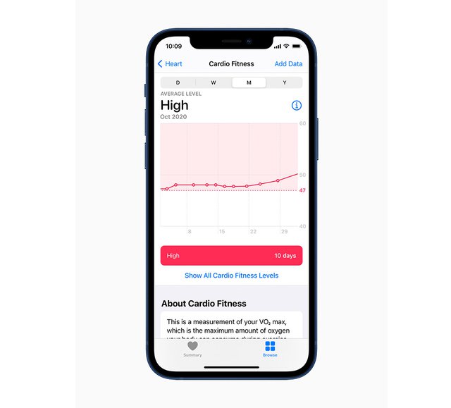 iOS 14.3とwatchOS 7.2を組み合わせることで、Apple WatchのユーザーはiPhoneの「ヘルスケア」アプリで自分の心肺機能のレベルを確認でき、心肺機能のレベルが「低い」となった場合に、Apple Watch上で通知を受け取れる。