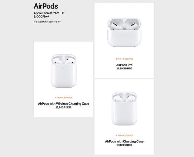 AirPodsは、ワイヤレス充電対応の「AirPods with Wireless Charging Case」、ワイヤレス充電非対応の「AirPods with Charging Case」、そして「AirPods Pro」の3機種がギフトカードプレゼントの対象となっている。いずれも3,000円分がプレゼントされる。