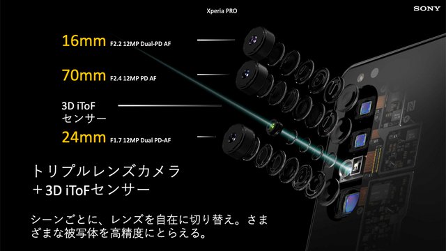 基本的な部分はXperia 1IIを踏襲している。カメラは同様のトリプルレンズカメラと3D iToFセンサーによる構成となり、16mm/24mm/70mmのレンズを搭載する。最高20コマ/秒のAF/AE追従連射に対応し、リアルタイム瞳AFも可能だ。