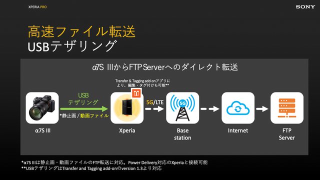同社α7S IIIといった対応カメラとUSB接続することで、FTPサーバーへのダイレクト転送も可能。アプリ「Transfer & Tagging add-on」を利用することで、編集やタグ付けにも対応する。