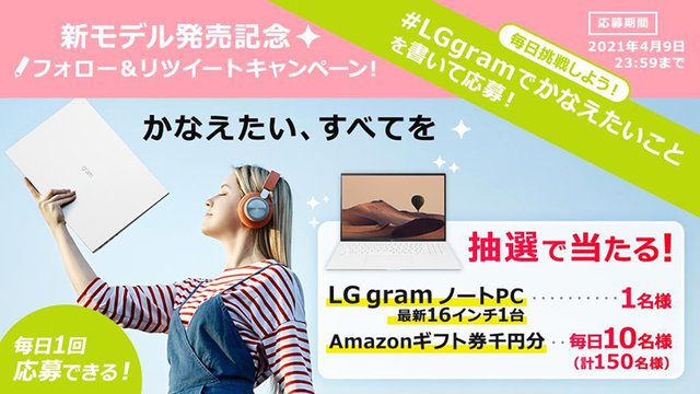 キャンペーンでは、LGエレクトロニクス・ジャパン公式Twitterアカウント(@LGE_jp)をフォローの上、キャンペーンツイートをリツイート、またはハッシュタグ「#LGgramでかなえたいこと」をつけてやりたいことを投稿すると、抽選で1名に16インチの「LG gram」2021年モデルが当たる。なお、カラーはスノーホワイト/オブシディアンブラック/クオーツシルバーの3色展開となるが、当選品の色指定は不可。