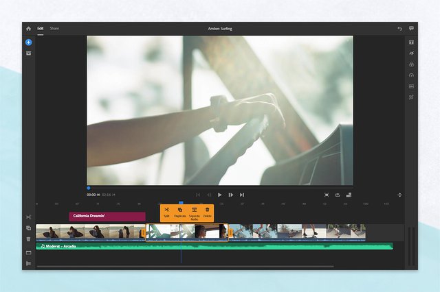 またPremiere RushのiOS版では、ビデオクリップのタイムラインをタップするとコンテキストメニューを表示できるようになった。このコンテキストメニューを使って、クリップを分割、複製、削除することもできるようになった。