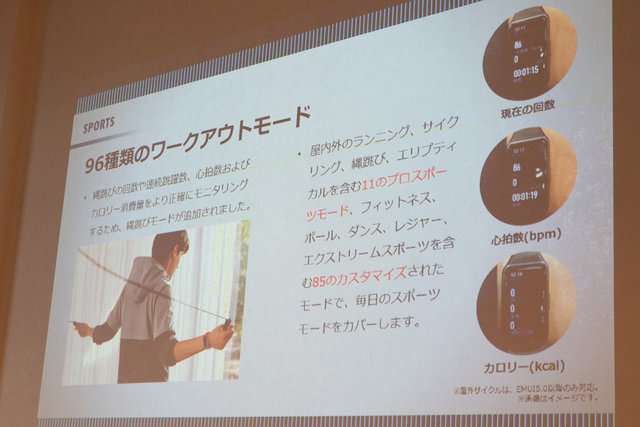 96種類のワークアウトモードを搭載。ランニングやサイクリング、縄跳びなど11のプロスポーツモード、フィットネスやボール、ダンス、レジャーなど85のカスタマイズされたモードを備える。ランニング、ウォーキング、エリプティカル、ローイングなど6種類のワークアウトについては、自動識別に対応する。