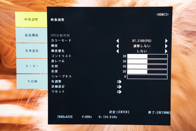 液晶パネルの解像度は7,680×4,320ドットで、最大表示色は約10.7億色に対応する。8Kの高解像度を生かすため、表面処理は光沢(グレア)を採用。色域は、Rec.2020を85%、DCI-P3を96%、Adobe RGBを100%、sRGBを100%カバーする。