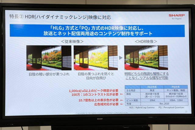 HDRは、放送で用いられるHLG方式と、ネット動画や映画で採用されるPQ方式に対応する。ピーク輝度は1,000cd/m2、全白時の輝度は800cd/m2。バックライトは直下型LEDで、512分割のエリア制御が行われる。コントラスト比は100万:1。