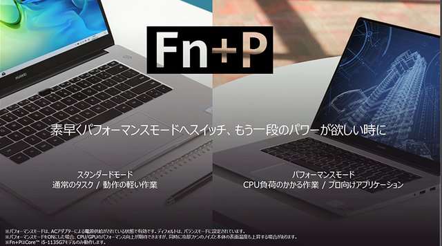 通常タスクや動作の軽い作業に適した「スタンダードモード」と、プロ向けアプリケーションの利用などCPU負荷のかかる重たい作業時に自動で切り替わる「パフォーマンスモード」(ACアダプターによる電源供給時に有効)を装備。Core i5モデルでは、「Fn」+「P」キーを押すことで自らモード切り替えも行える。なお、デフォルト状態は「バランスモード」が適用される。