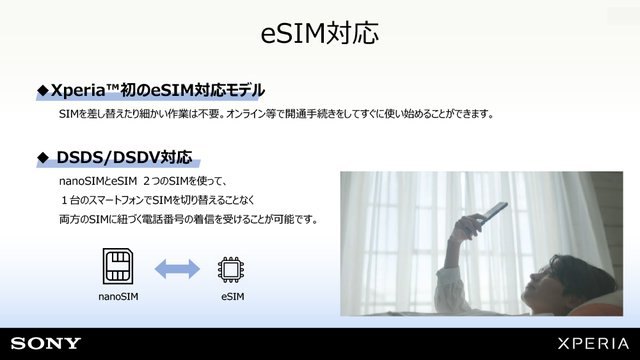 Xperia初のeSIMに対応する。nanoSIMとeSIMを使うことで、SIMを切り替えることなく、1台のスマートフォンで両方の電話番号の着信も可能だ。また、最大1TBまでのmicroSDカードも利用できる。