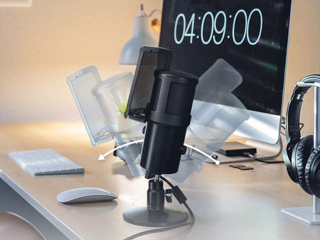 また、録音中のポップノイズを防ぐマグネット着脱式のポップフィルターを付属品として用意。その他、角度を最大90°まで調節可能なマルチアングルサポート台と、テーブル設置用のスタンド台座、接続用のUSBケーブル(A to microB /約1.5m)同梱する。なお、マルチアングルサポート台は1/4インチネジ穴を備えており、1/4-20 UNC規格に対応する市販のマイクアームやスタンドと組み合わせることができると同社は説明している。