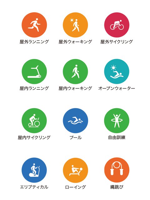 モニタリングによるデータ解析/記録でトレーニング効果を可視化できるワークアウトモードでは、新たに「縄跳び」を追加。合わせて計12種類のコースを用意し、幅広い運動に対応する。なお、前モデルもアップデートにより順次「縄跳び」モードを追加できる。