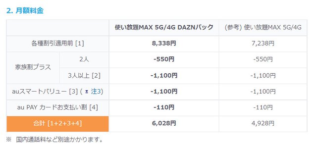 DAZNは先日、2月22日から利用料を値上げすると発表しており、利用料は通常月額3,000円となる予定で、「使い放題MAX 5G/4G DAZNパック」ではDAZN利用料を含めて、通常月額8,338円で提供する。