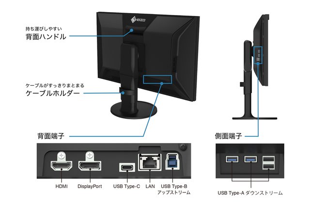 進化点として、USB Type-C接続に対応。ケーブル1本の接続により、画面表示/USB信号の伝送/PCへの給電が行える。また新たに有線LANポートをモニター側に搭載し、4基のUSB Type-Aポート(USB 3.1 Gen1が2つ、USB 2.0が2つ)も備えているため、ドッキングステーションのように利用可能。給電能力はCG2700Xが94W、CG2700Sが92Wとなる。