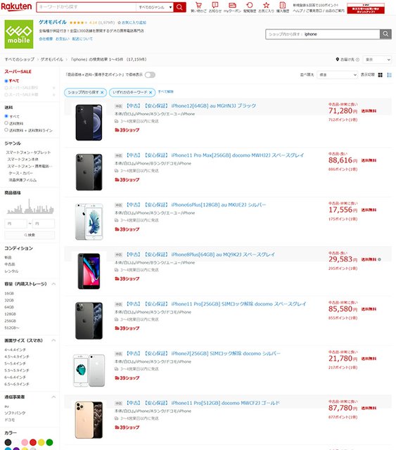 例えばゲオモバイル楽天市場店では、スーパーSALE期間中、全商品をポイント10倍に。同ショップが販売している中古iPhone各モデルもポイント10倍になる。